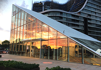 The curtain wall for the art gallery was custom designed using a transom extrusion that was developed specifically for the project. There are no mullion frames with transoms being supported laterally via struts pin jointed to an inclined steel column. Vertical support is provided by a cable suspension system. Vertical joints between the glass panels are silicone butt jointed and the glass wall is formed by a series of intersecting conical shaped structures.